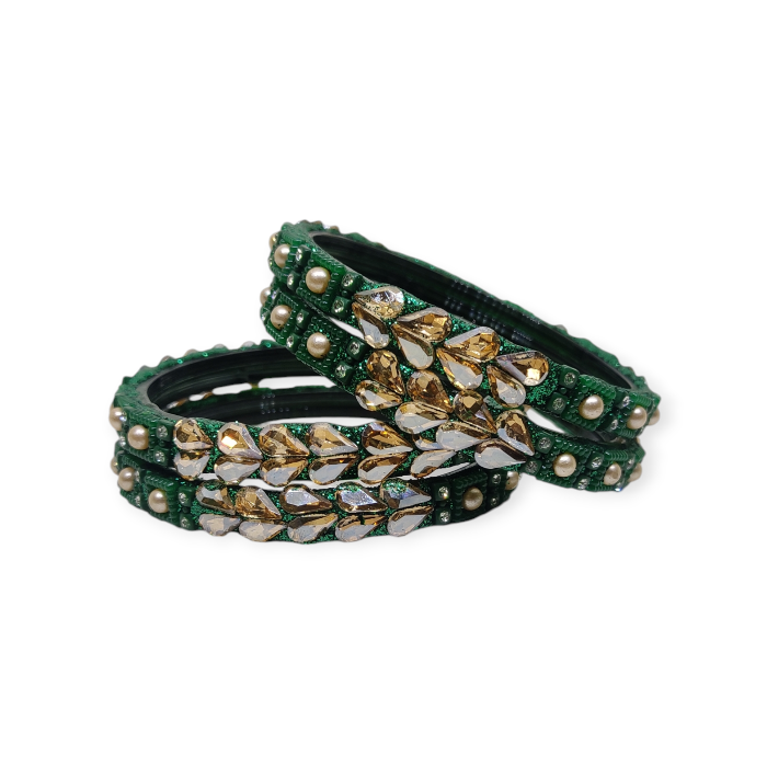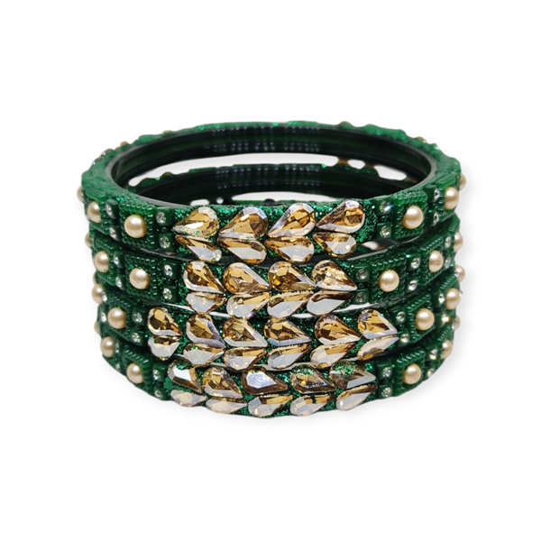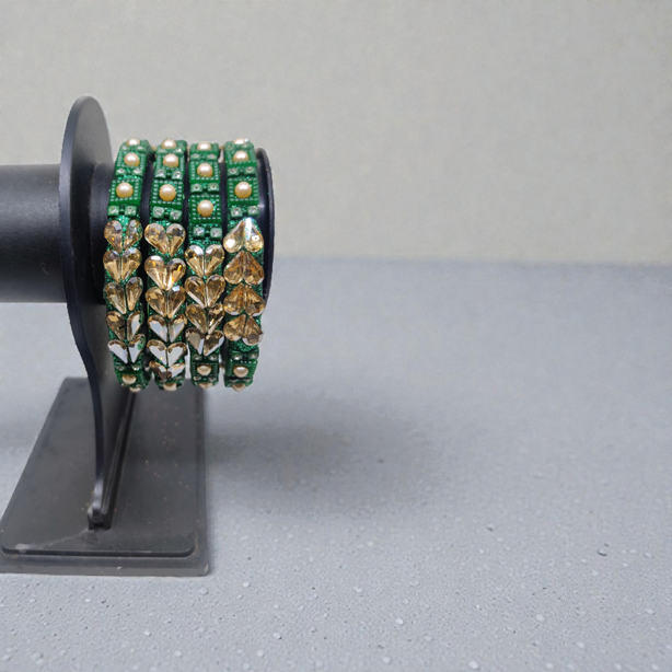 Fancy Beads and Stone Stud Glass Kangan, Pack of 4 Pieces, Green Color