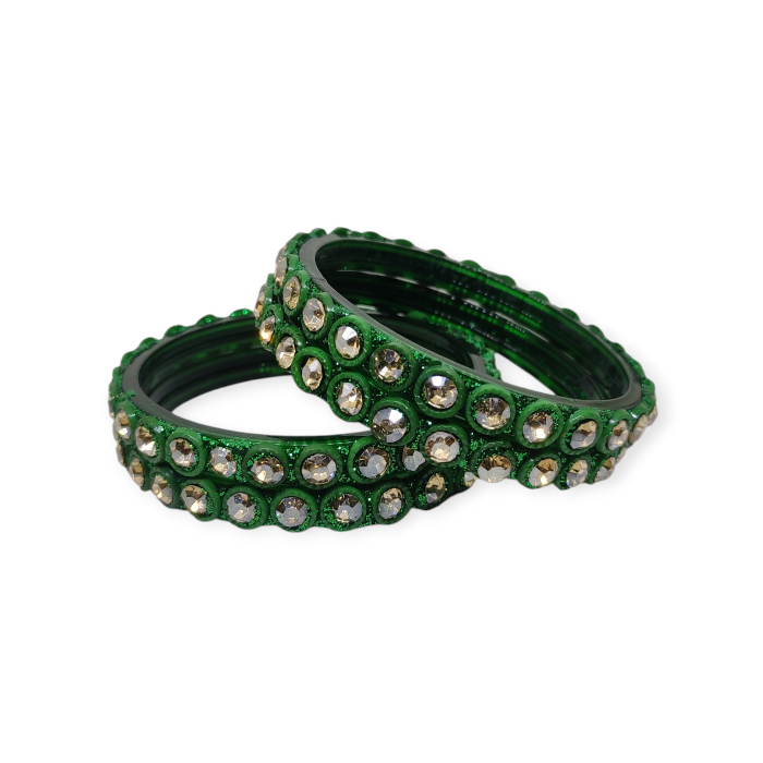 Fancy Beads and Stone Stud Glass Kangan, Pack of 4 Pieces, Green Color