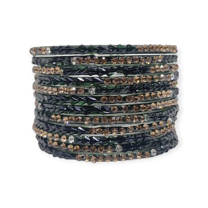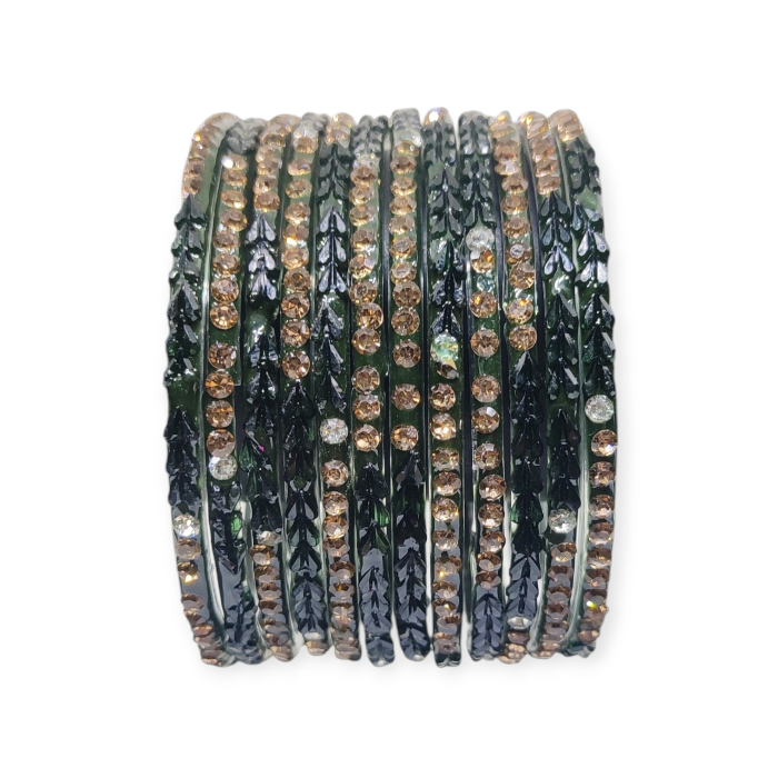 Fancy Stone Stud Glass Bangles, Pack of 12 Pieces, Kai Green Color