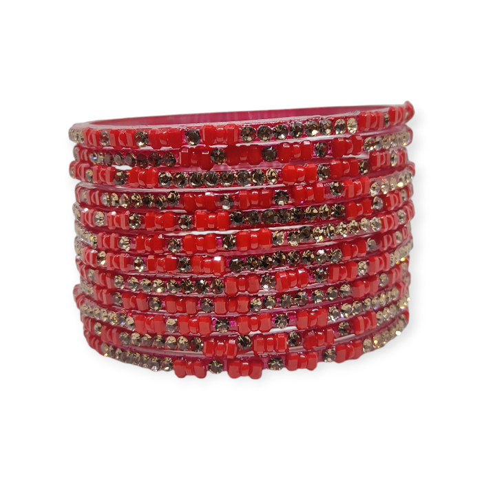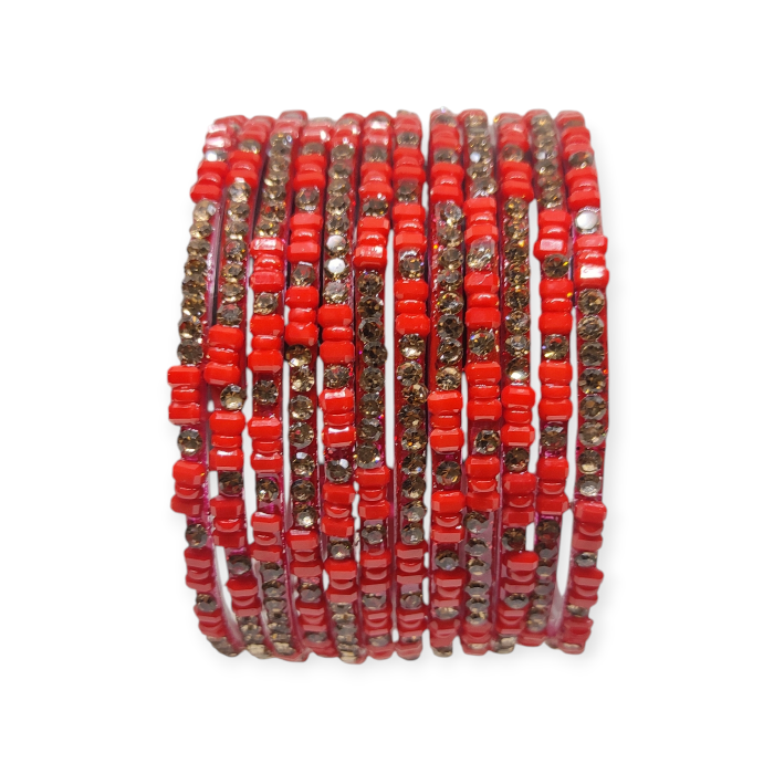 Fancy Stone Stud Glass Bangles, Pack of 12 Pieces, Red Color