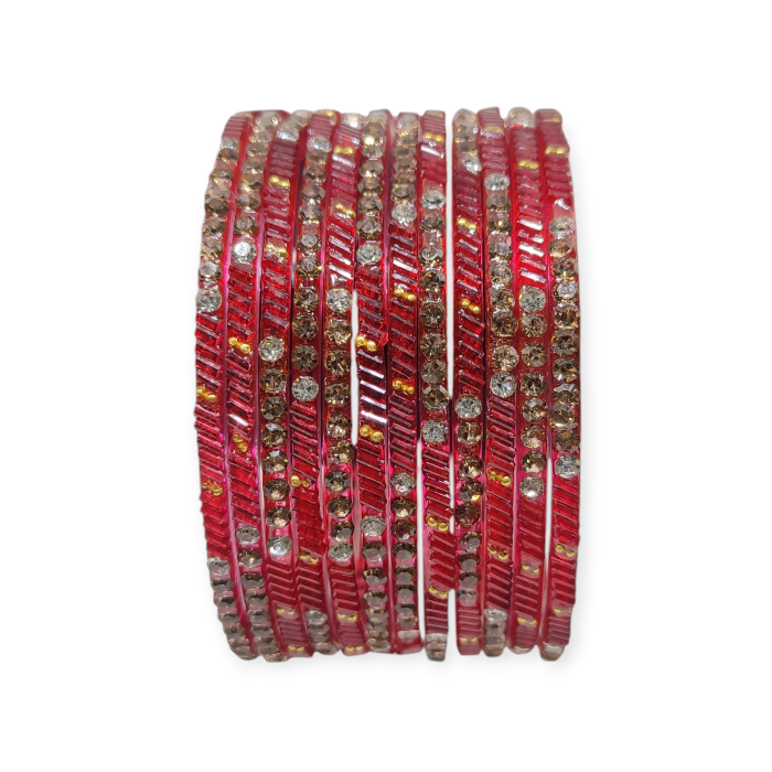 Fancy Stone Stud Glass Bangles, Pack of 12 Pieces, Red Color