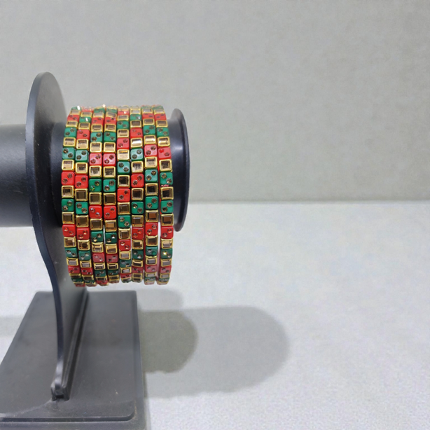Fancy Stone Stud Glass Bangles, Pack of 8 Pieces, Red-Green Color