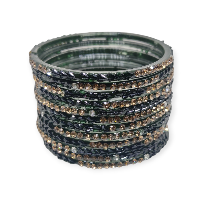 Fancy Stone Stud Glass Bangles, Pack of 12 Pieces, Kai Green Color