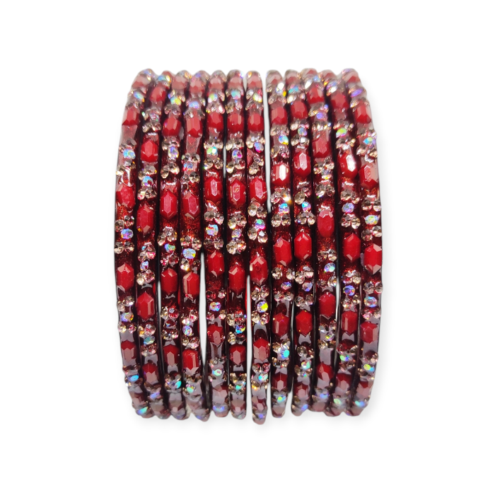 Fancy Stone Stud Glass Bangles, Pack of 12 Pieces, Maroon Color