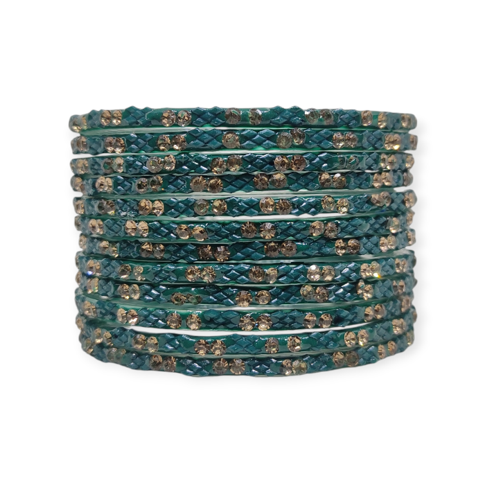 Fancy Stone Stud Glass Bangles, Pack of 12 Pieces, Radium Color