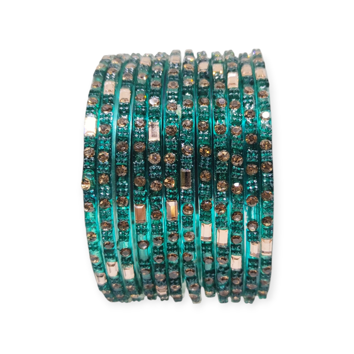 Fancy Stone Stud Glass Bangles, Pack of 12 Pieces, Radium Color