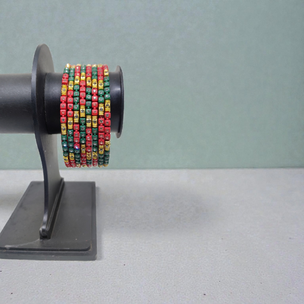 Fancy Stone Stud Glass Bangles, Pack of 8 Pieces, Red-Green Color